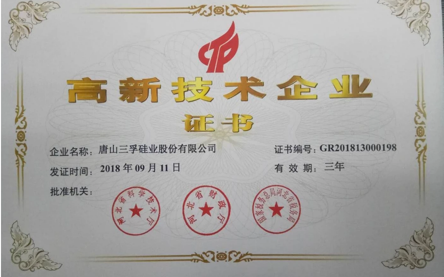 近年來(lái),公司以申報(bào)高新技術(shù)企業(yè)為契機(jī),科技創(chuàng)新工作取得了突飛猛進(jìn)的成績(jī),科技研發(fā)平臺(tái)登上新臺(tái)階。公司榮獲唐山市新興領(lǐng)軍企業(yè)稱號(hào),“低碳三氯氫硅新產(chǎn)品開(kāi)發(fā)”榮獲唐山市技術(shù)創(chuàng)新優(yōu)秀項(xiàng)目獎(jiǎng)。氫氧化鉀獲得河北省優(yōu)質(zhì)產(chǎn)品、河北省中小企業(yè)名牌產(chǎn)品。公司先后通過(guò)了河北省“專精特新中小企業(yè)”、“科技小巨人”認(rèn)定。公司研發(fā)機(jī)構(gòu)通過(guò)了“A級(jí)河北省規(guī)模以上工業(yè)企業(yè)研發(fā)機(jī)構(gòu)”及“唐山市企業(yè)技術(shù)中心”認(rèn)定,公司承擔(dān)的“唐山市氯硅烷新材料工程技術(shù)研究中心”納入唐山市科技研發(fā)平臺(tái)建設(shè)重點(diǎn)培養(yǎng)計(jì)劃。“95%氫氧化鉀新產(chǎn)品開(kāi)發(fā)”等4個(gè)項(xiàng)目納入省市新產(chǎn)品新技術(shù)開(kāi)發(fā)計(jì)劃。“高純四氯化硅提純二期(2萬(wàn)噸/年)改擴(kuò)建項(xiàng)目”等2個(gè)項(xiàng)目納入省重點(diǎn)技術(shù)改造計(jì)劃。截止目前,公司擁有授權(quán)專利18項(xiàng),其中,發(fā)明1項(xiàng)。
