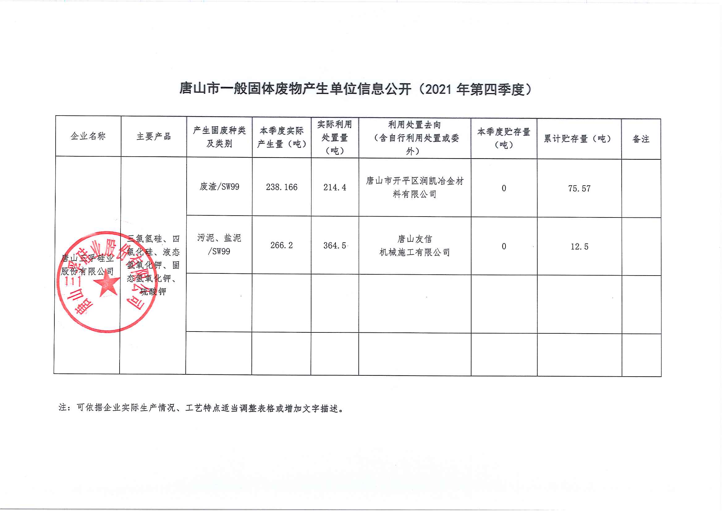 唐山三孚硅業(yè)股份有限公司2021年四季度一般固體廢物廢物信息公開
