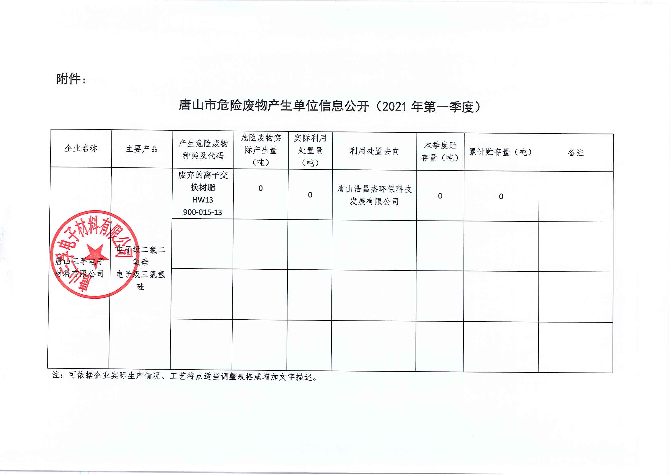 唐山三孚電子材料有限公司2021年1季度危險廢物產(chǎn)生單位信息公開