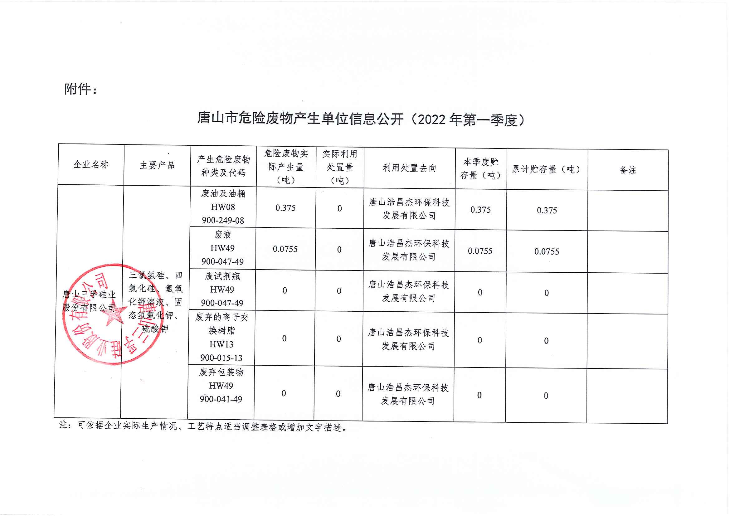 唐山三孚硅業(yè)股份有限公司2022年一季度危險廢物信息公開