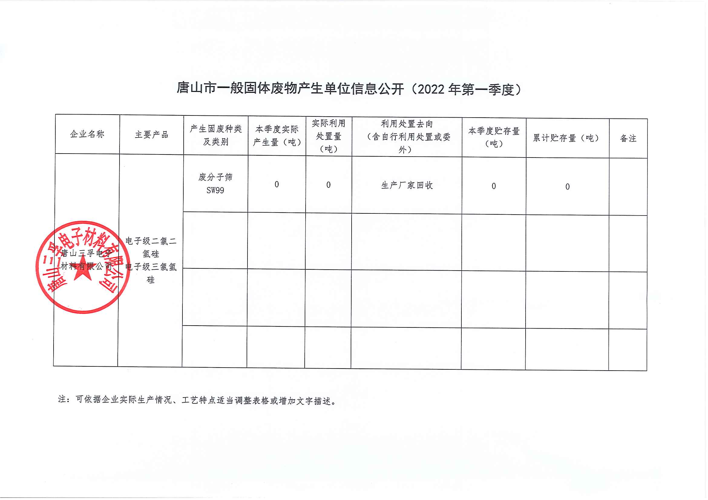 唐山三孚電子材料有限公司2022年一季度一般固廢信息公開