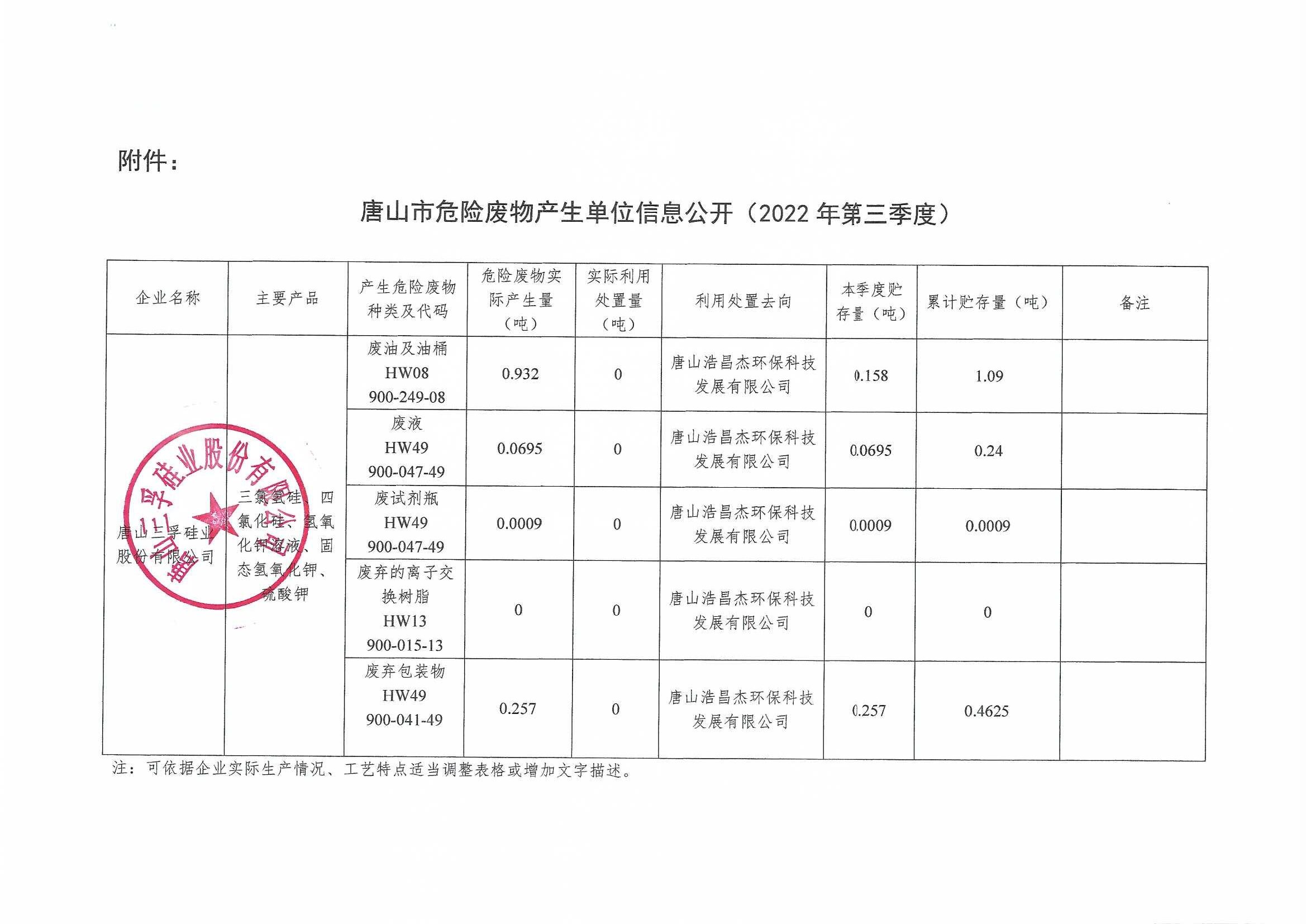 唐山三孚硅業(yè)股份有限公司2022年第三季度危險(xiǎn)廢物信息公開