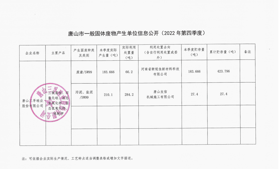 唐山三孚硅業(yè)股份有限公司2022年四季度一般固體廢物廢物信息公開